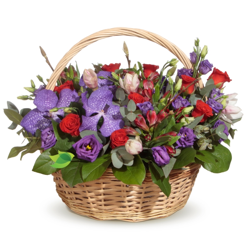 Букет состоит из 11 роз, 5 орхидей, 5 веток эустомы, 4 альстромерии, зелень, корзина, оазис.